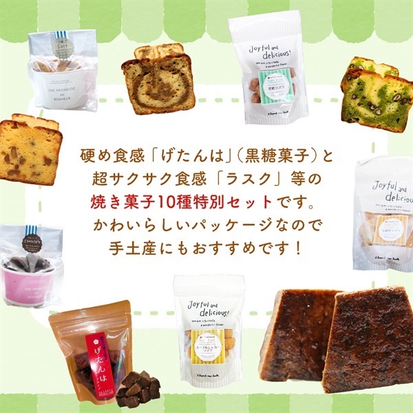 黒糖を使った鹿児島伝統菓子げたんはや、自家製ラスク、鹿児島県産素材を活かしたパウンドケーキなど、人気焼き菓子を詰め合わせた10種10個のセット。ギフトにも日常のおやつにも喜ばれる、バラエティ豊かなセットです。