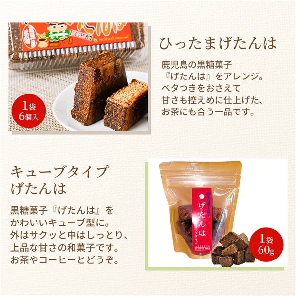 ・キューブげたんは:加工黒糖(国内製造)、小麦粉(国内製造)、黒みつ、上白糖、卵、水あめ/膨張剤 ・ひったまげたんは:加工黒糖(国内製造)、小麦粉(国内製造)、黒みつ、上白糖、卵、水あめ/膨張剤 ・あま塩クッキー:小麦粉(国内製造)、無塩バター、粉糖、卵、バニラベースト、海塩(鹿児島県産)/増粘剤(トラガントガム) ・チョコクッキー:小麦粉(国内製造)、チップチョコ、無塩バター、ココア、バニラベースト/増粘剤(トラガントガム) ・メープルシュガーラスク:小麦粉(国内製造)、マーガリン、メープルパウダー、グラニュー糖、食用精油、加工油脂、ドライイースト、食塩/イーストフード、乳化剤、増粘剤(グァーガム)、酵素、ビタミンC ・黒糖ラスク:小麦粉(国内製造)、マーガリン、加工黒糖、グラニュー糖、食用精油、加工油脂、ドライイースト、食塩/イーストフード、乳化剤、増粘剤(グァーガム)、酵素、ビタミンC ・お徳用ラスク:小麦粉(国内製造)、マーガリン、グラニュー糖、食用精油、加工油脂、ドライイースト、食塩/イーストフード、乳化剤、増粘剤(グァーガム)、酵素、ビタミンC ・パウンドケーキ(クルミ):卵(鹿児島県産)、無塩バター、さとうきび糖(国産)、小麦粉(国内製造)、アーモンドパウダー(アメリカ産)、クルミ(アメリカ産)/膨張剤 ・パウンドケーキ(コーヒー):卵(鹿児島県産)、無塩バター、グラニュー糖、小麦粉(国内製造)、アーモンドパウダー(アメリカ産)、コーヒー粉末(ブラジル産)/膨張剤 ・パウンドケーキ(モリンガ):卵(鹿児島県産)、無塩バター、グラニュー糖、小麦粉(国内製造)、アーモンドパウダー(アメリカ産)、モリンガパウダー(鹿児島県産)、小豆(北海道産)/膨張剤 - アレルゲン(28品目中):