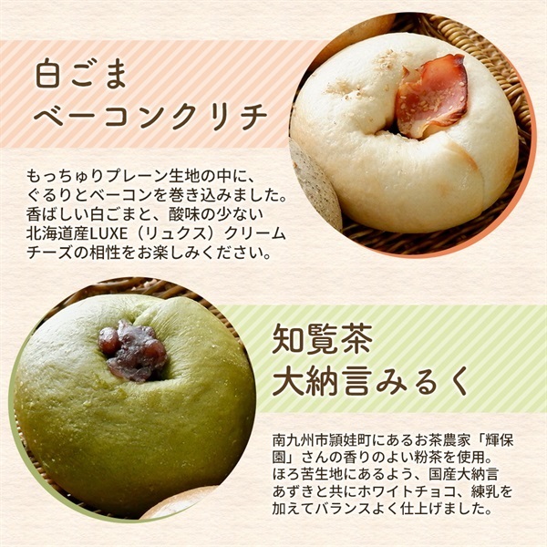 【ブルーベリークリームチーズ】小麦、乳 【紅茶レモンクリームチーズ】小麦、乳 【オランジュショコラ】小麦、乳、卵、大豆、落花生、オレンジ 【スイートポテト】小麦、乳、ごま 【白ごまベーコンクリチ】小麦、乳、卵、豚肉、ごま 【知覧茶大納言みるく】小麦、乳 【紅茶蜜りんご】小麦、乳、りんご、くるみ 【キャラメルマキアート】小麦、乳、大豆、アーモンド